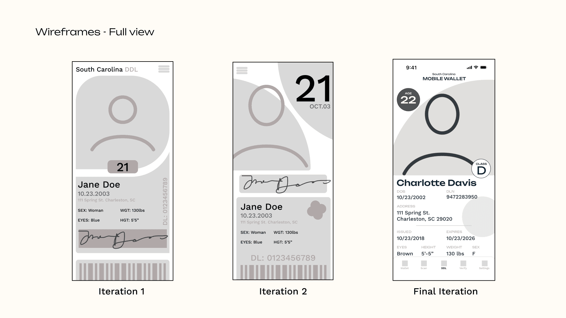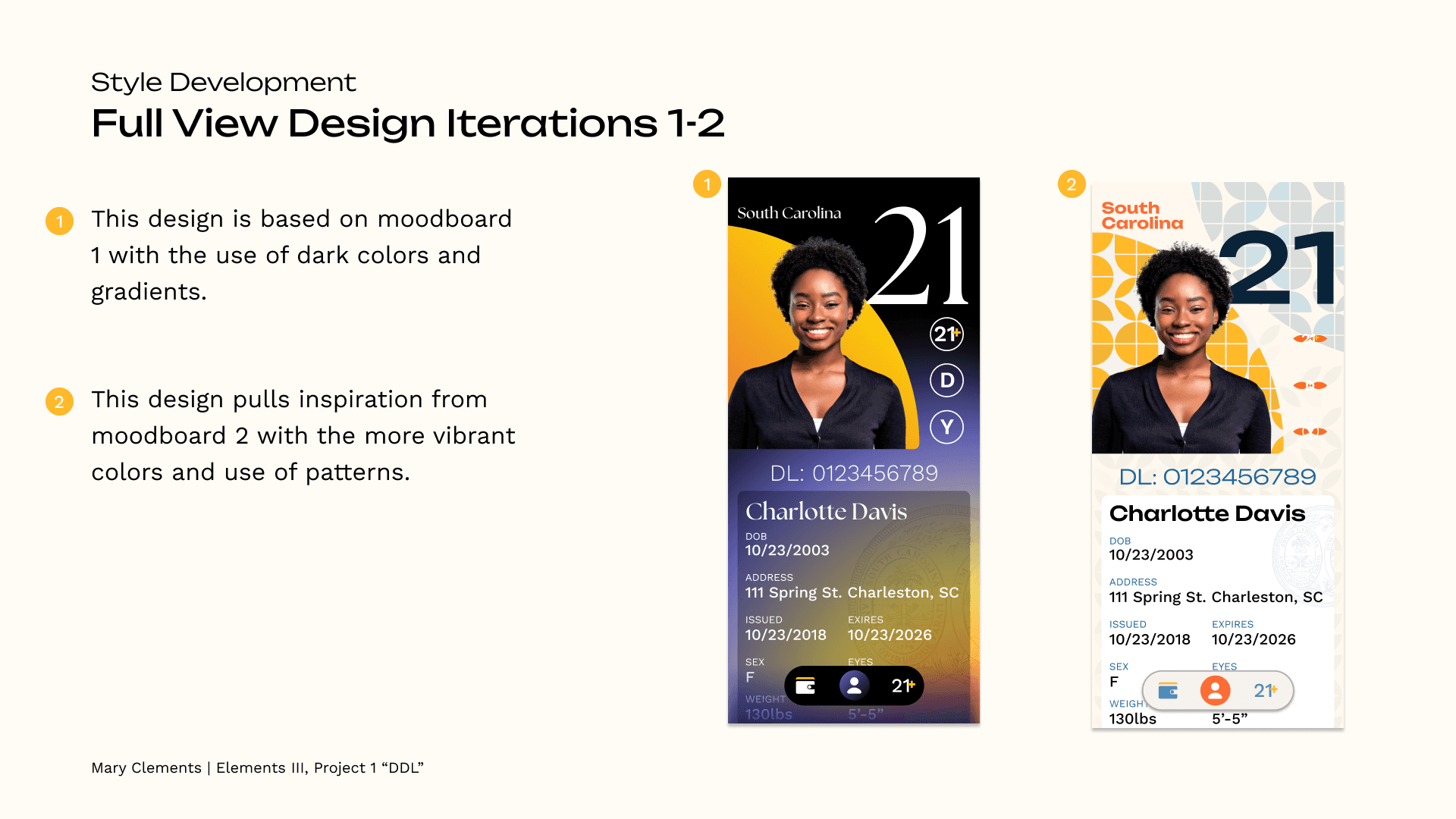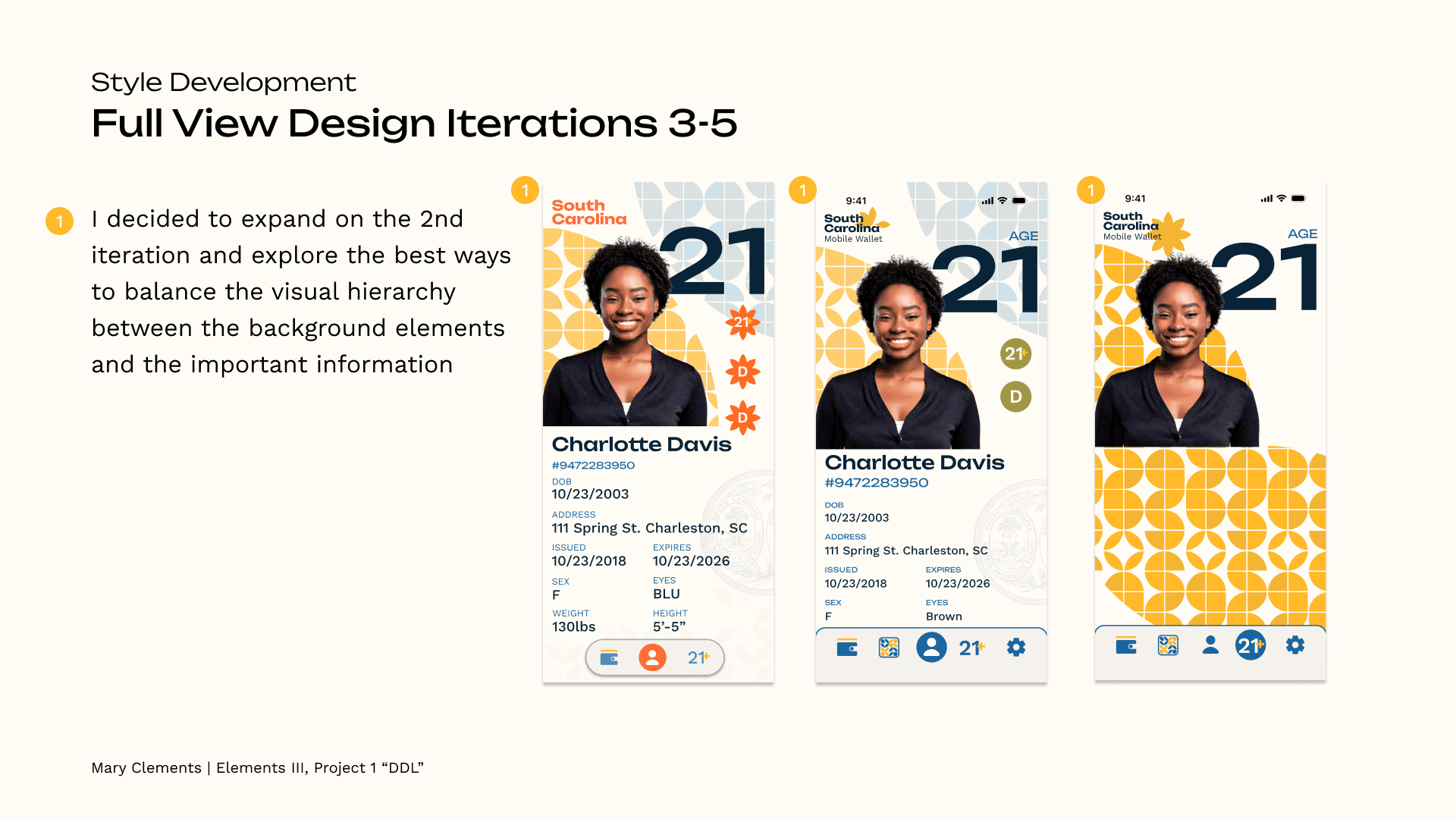 The final digital driver’s license design successfully modernizes the traditional ID format while maintaining clarity, security, and ease of use. By incorporating South Carolina’s visual identity, the design feels both official and engaging. The intuitive layout and photo integration enhance quick verification, while the dynamic security feature adds an extra layer of fraud prevention. Overall, the design balances branding with functionality, ensuring a seamless user experience that improves upon existing digital ID solutions.
